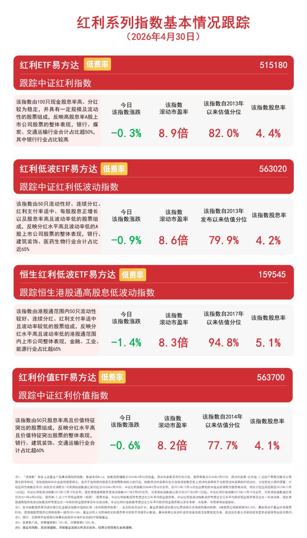 4月30日,建材、石油天然气、银行等高股息板块短线回调。截至收盘,中证红利指数下跌0.3%,中证红利价值指数下跌0.6%,中证红利低波动指数下跌0.9%,恒生港股通高股息低波动指数下跌1.4%。Wind数据显示,截至昨日,红利低波ETF易方达(563020,联接基金A/C:020602/020603)连续6个交易日“吸金”,合计超5亿元。